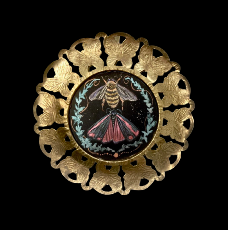 This piece is an original miniature painting painted with pearlescent watercolors on black Fabriano paper. It is framed in a vintage 1960’s butterfly frame. The painting measures 3x3 inches round and the frame 6x6 inches.