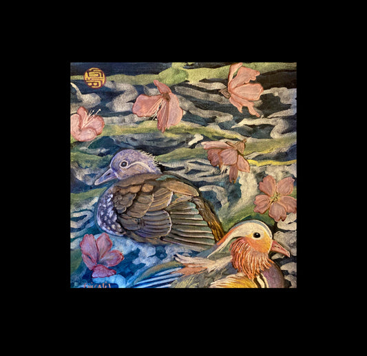 Mandarin ducks and cherry blossoms pearlescent watercolor painting 8x8